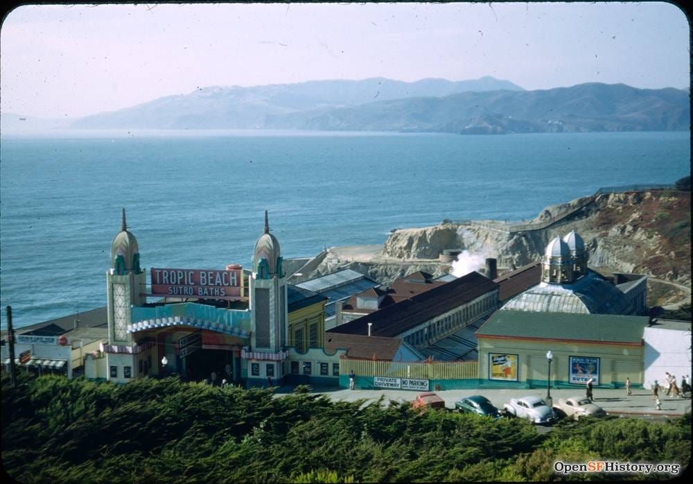 This might not make sense upon first reading. Most of us have heard of Sutro Baths. Many of us have probably been there and seen the remnants of this once glorious house of swimming pools. If you’ve seen old pictures, you know how big and impressive it was. It was fed by the ocean and contained a multitude of pools along with slides and rope swings and was surrounded by stadium seating. I saw one picture that claimed to be taken on a day that over 1900 people were there swimming and lounging. Must’ve been a hot day because I'm sure on most days throughout the year, it wasn’t nearly so popular owing to the cool SF weather.